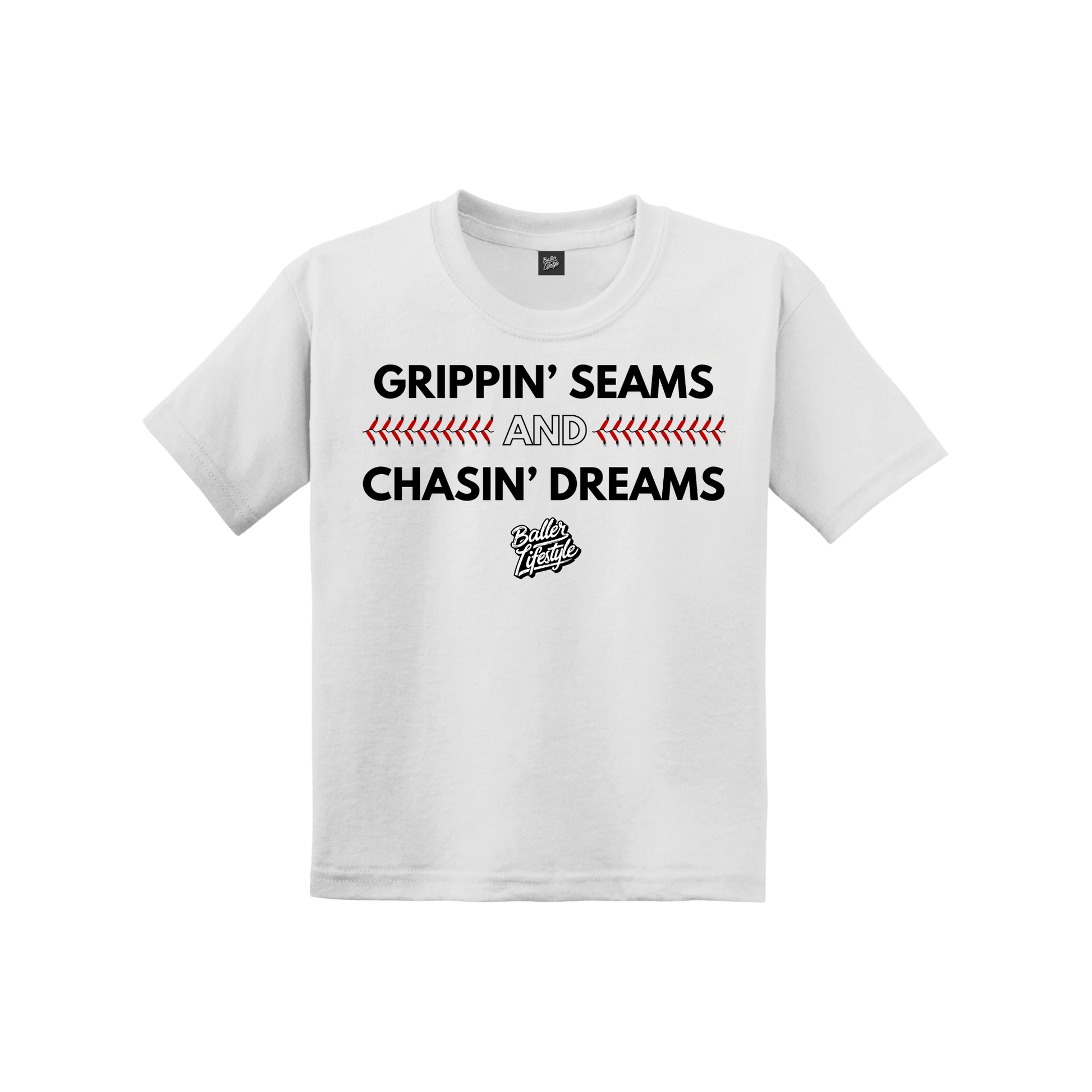 Show off your passion for baseball with our Grippin Seams and Chasin Dreams youth T-Shirt by Baller Lifestyle. This stylish baseball t-shirt captures the essence of baseball lifestyle off the field. High-quality and breathable fabric. Ideal for school, game days, vacations and casual days hitting at the cages. Baller Lifestyle shirts is a must have for any baseball enthusiast with a love for the game.